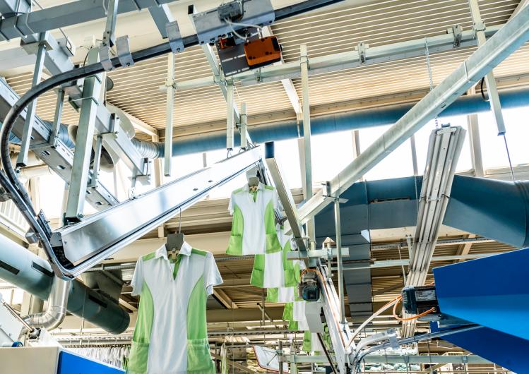 The VarioTrans transport system ensures transport of laundry items from the VarioLoad loading station to the VarioJet tunnel finisher and on to the VarioFold folding machine. The system seamlessly integrates into existing production processes and structures, and is compatible with technical systems of other makes.