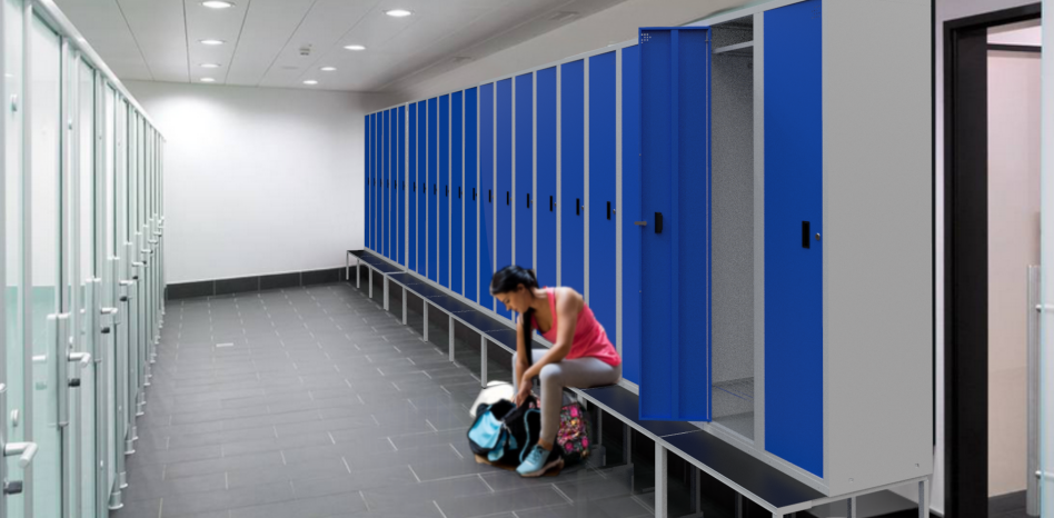 The Personal storage locker is ideal for locker rooms in professional environments but also sports centers, schools, or offices. The lockers come with two shelves, a clothes rail, and two hooks at each side to easily store clothes, bags, and shoes. A key lock assures that all personal belongings are safely stored. The lockers are equipped with adjustable feet and have ventilation holes on the front and back, and can be completed with a slope top and with a single stand. Also available is a bench which holds the lockers perfectly in place.